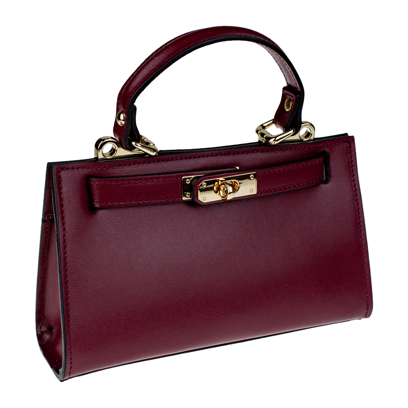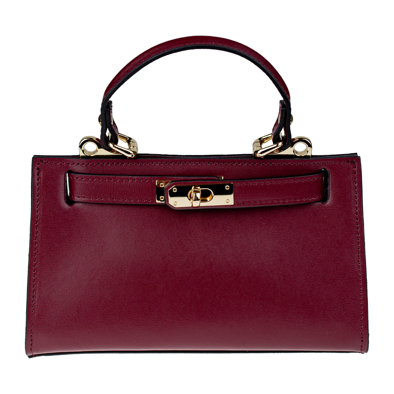 Malá kabelka z pevné kůže v bordó barvě. Kabelku lze nosit v ruce nebo přes rameno. Max. délka přídavného pásku je 115 cm. Kabelka je vybavena důmyslným  a elegantním zapínáním. Uvnitř kabelky nalezneme kapsu na mobil či klíče.