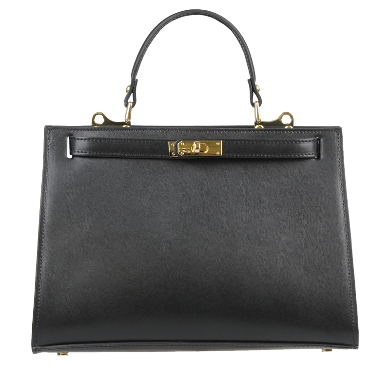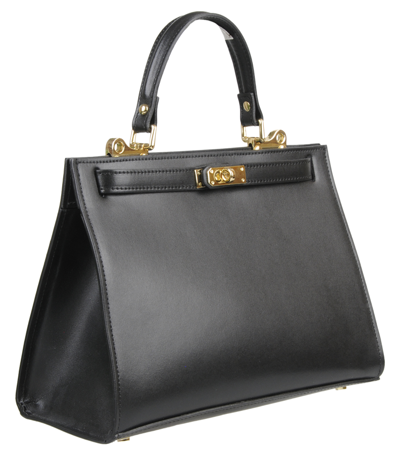 Krásná kabelka z pevné kůže v černé barvě. Kabelku lze nosit v ruce nebo přes rameno. Max. délka přídavného pásku je 115 cm. Kabelka je vybavena důmyslným  a elegantním zapínáním. Uvnitř kabelky nalezneme kapsu na mobil či klíče.