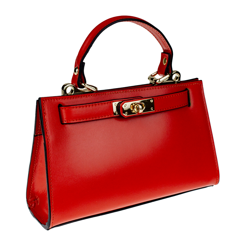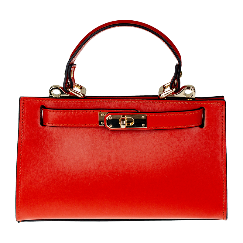 Malá kabelka z pevné kůže v cihlové barvě. Kabelku lze nosit v ruce nebo přes rameno. Max. délka přídavného pásku je 115 cm. Kabelka je vybavena důmyslným  a elegantním zapínáním. Uvnitř kabelky nalezneme kapsu na mobil či klíče.