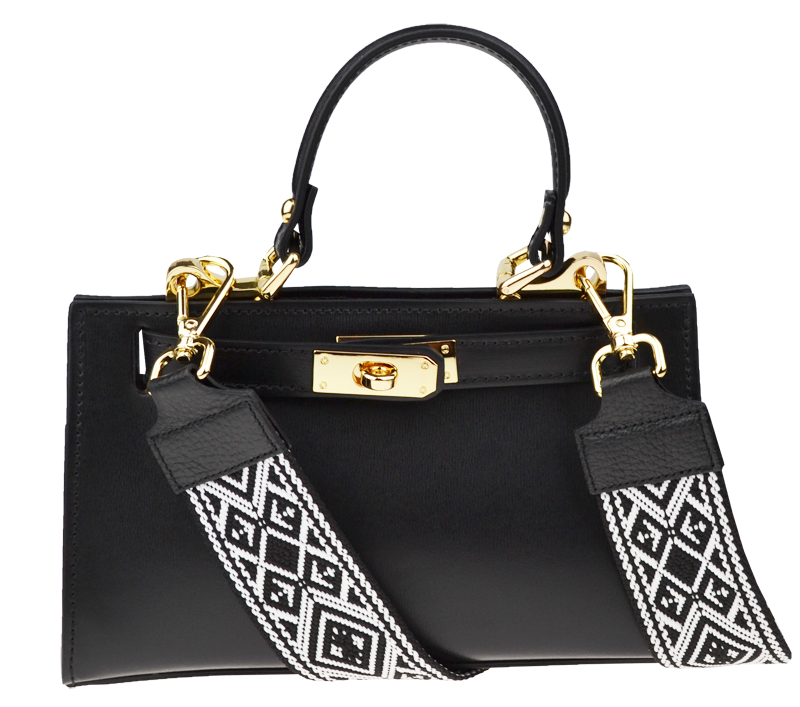 Malá kabelka z pevné kůže v černé barvě. Kabelku lze nosit v ruce nebo přes rameno. Max. délka přídavného pásku je 115 cm. Kabelka je vybavena důmyslným  a elegantním zapínáním. Uvnitř kabelky nalezneme kapsu na mobil či klíče.