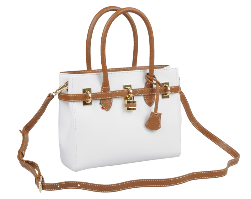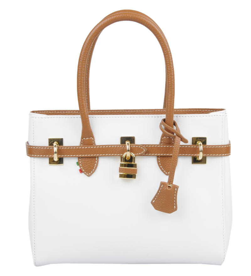 Malá  kabelka v bílé barvě, nositelná přes rameno nebo v ruce s propracovaným designem a dekoračním zámečkem. Tato kožená kabelka je uzavíratelná na zip. Vyrobena z pravé poctivé kůže. Uvnitř disponuje kapsou na zip a 2 malými kapsami vhodnými např. pro Váš mobil a peněženku.