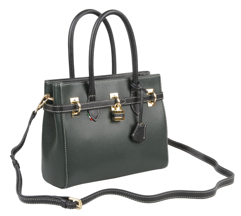 Malá  kabelka v tmavě-zelené barvě, nositelná přes rameno nebo v ruce s propracovaným designem a dekoračním zámečkem. Tato kožená kabelka je uzavíratelná na zip. Vyrobena z pravé poctivé kůže. Uvnitř disponuje kapsou na zip a 2 malými kapsami vhodnými např. pro Váš mobil a peněženku.