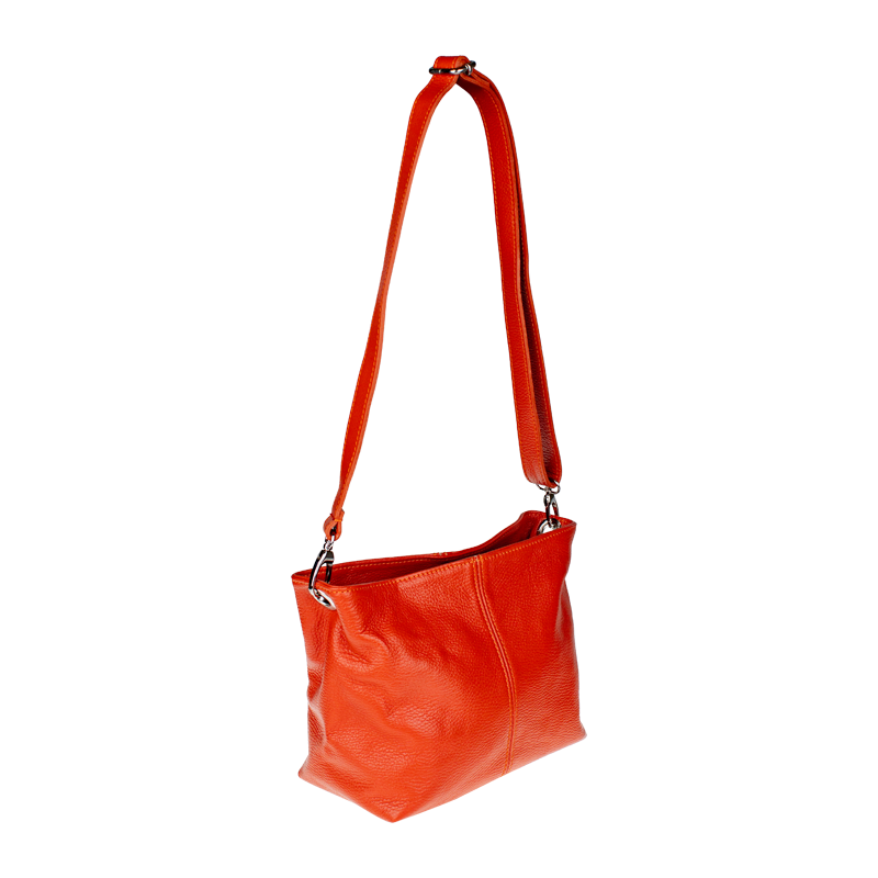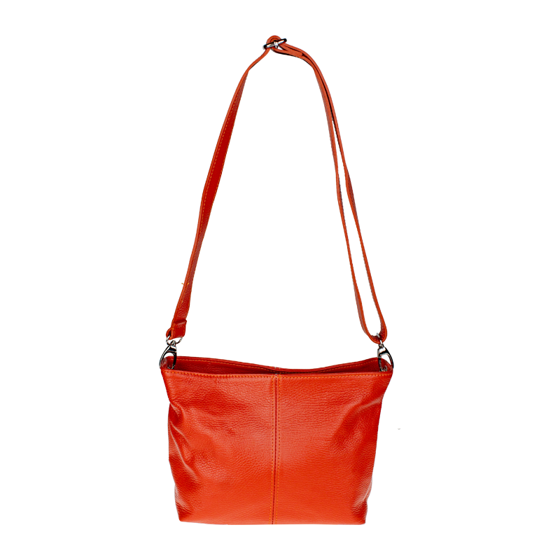 Oranžová kabelka nositelná přes rameno či cross-body (křížem). Tato kožená kabelka je uzavíratelná na zip. Uvnitř kabelky najdeme přepážku uprostřed, která zároveň slouží jako kapsa na zip, a na boční stěně pak kapsu na zip. Hloubka jejího dna je 13 cm. Kabelka má navíc nastavitelný popruh s maximální délkou cca 120 cm.
