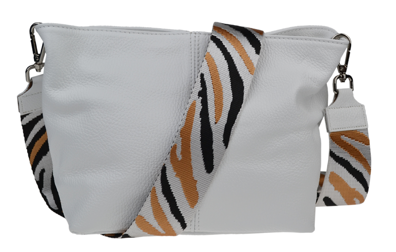 Bílá kabelka nositelná přes rameno či cross-body (křížem). Tato kožená kabelka je uzavíratelná na zip. Uvnitř kabelky najdeme přepážku uprostřed, která zároveň slouží jako kapsa na zip, a na boční stěně pak kapsu na zip. Hloubka jejího dna je 13 cm.
