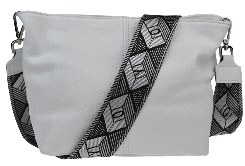Bílá kabelka nositelná přes rameno či cross-body (křížem). Tato kožená kabelka je uzavíratelná na zip. Uvnitř kabelky najdeme přepážku uprostřed, která zároveň slouží jako kapsa na zip, a na boční stěně pak kapsu na zip. Hloubka jejího dna je 13 cm.