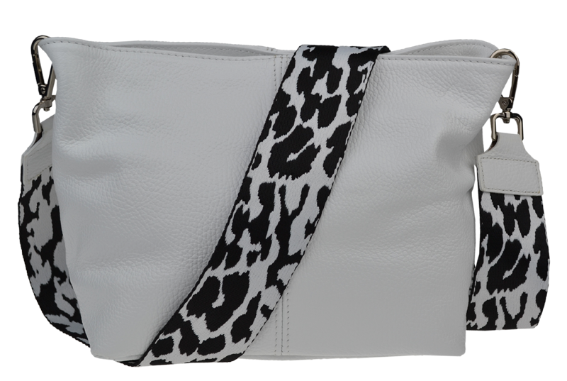 Bílá kabelka nositelná přes rameno či cross-body (křížem). Tato kožená kabelka je uzavíratelná na zip. Uvnitř kabelky najdeme přepážku uprostřed, která zároveň slouží jako kapsa na zip, a na boční stěně pak kapsu na zip. Hloubka jejího dna je 13 cm.