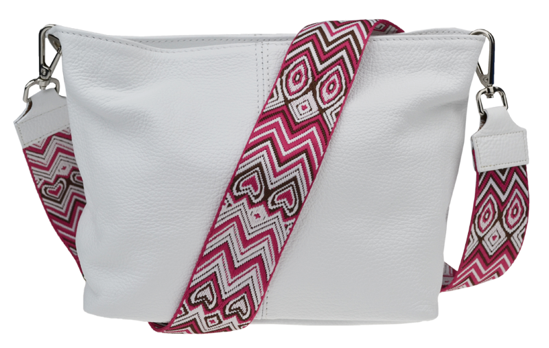 Bílá kabelka nositelná přes rameno či cross-body (křížem). Tato kožená kabelka je uzavíratelná na zip. Uvnitř kabelky najdeme přepážku uprostřed, která zároveň slouží jako kapsa na zip, a na boční stěně pak kapsu na zip. Hloubka jejího dna je 13 cm.