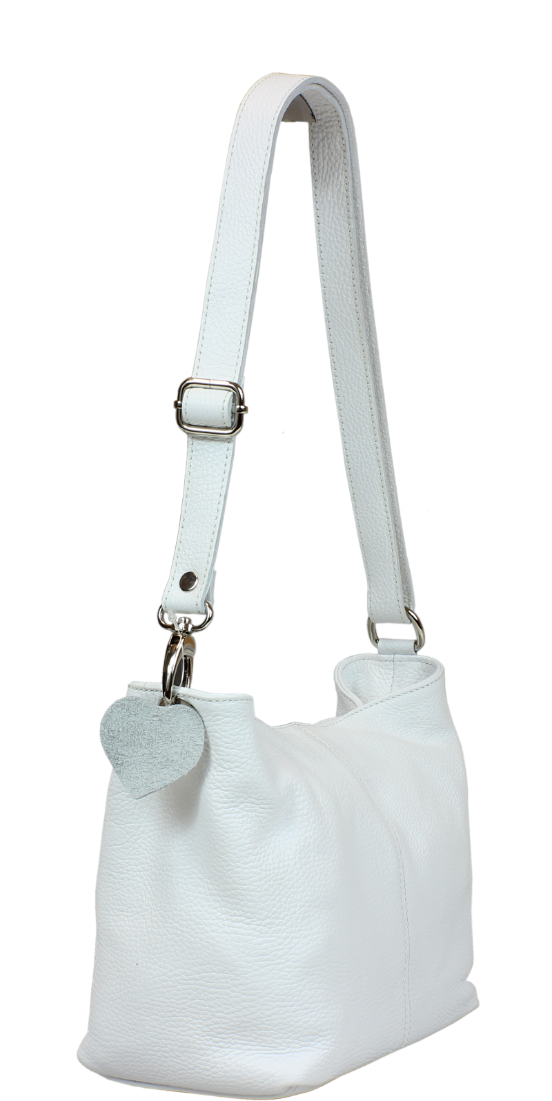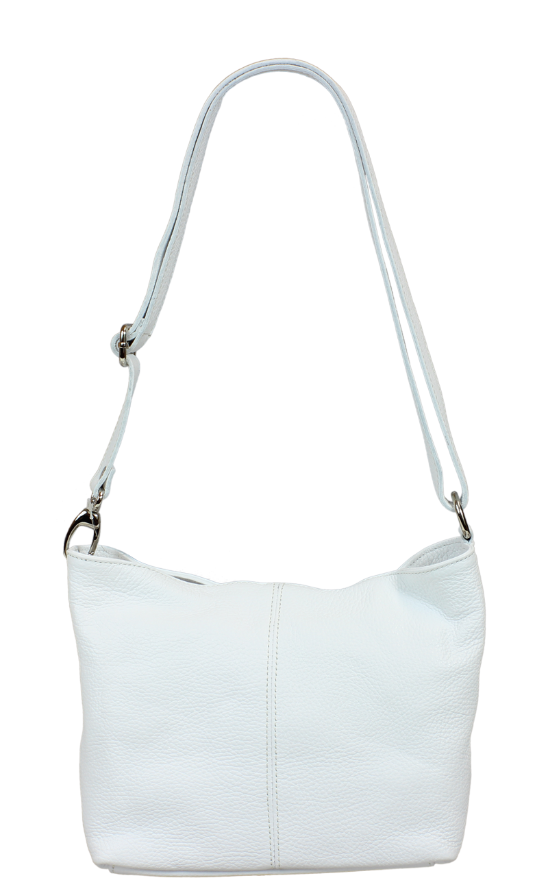 Bílá kabelka nositelná přes rameno či cross-body (křížem). Tato kožená kabelka je uzavíratelná na zip. Uvnitř kabelky najdeme přepážku uprostřed, která zároveň slouží jako kapsa na zip, a na boční stěně pak kapsu na zip. Hloubka jejího dna je 13 cm. Kabelka má navíc nastavitelný popruh s maximální délkou cca 120 cm.