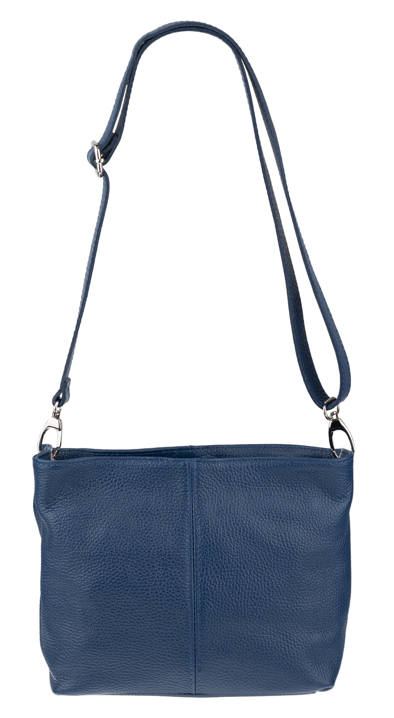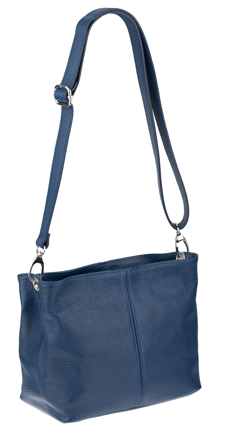 Modrá kabelka nositelná přes rameno či cross-body (křížem). Tato kožená kabelka je uzavíratelná na zip. Uvnitř kabelky najdeme přepážku uprostřed, která zároveň slouží jako kapsa na zip, a na boční stěně pak kapsu na zip. Hloubka jejího dna je 13 cm. Kabelka má navíc nastavitelný popruh s maximální délkou cca 120 cm.