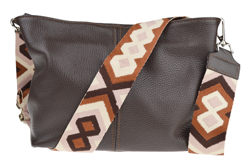 Set kabelky a přídavného popruhu. Kabelka nositelná přes rameno či cross-body (křížem). Hnědá kožená kabelka je uzavíratelná na zip. Uvnitř kabelky najdeme přepážku uprostřed, která zároveň slouží jako kapsa na zip, a na boční stěně pak kapsu na zip. Hloubka jejího dna je 13 cm.