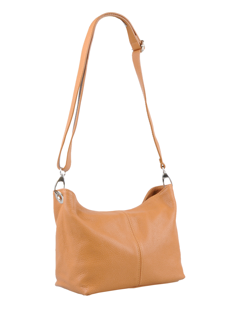 Kabelka nositelná přes rameno či cross-body (křížem) v moderní camel barvě. Tato kožená kabelka je uzavíratelná na zip. Uvnitř kabelky najdeme přepážku uprostřed, která zároveň slouží jako kapsa na zip, a na boční stěně pak kapsu na zip. Hloubka jejího dna je 13 cm. Kabelka má navíc nastavitelný popruh s maximální délkou cca 120 cm.