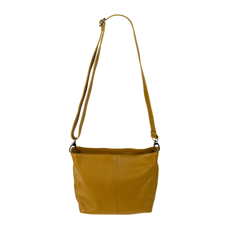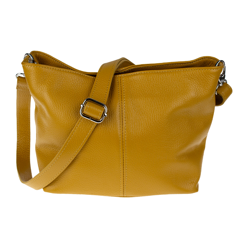 Žlutá kabelka nositelná přes rameno či cross-body (křížem). Tato kožená kabelka je uzavíratelná na zip. Uvnitř kabelky najdeme přepážku uprostřed, která zároveň slouží jako kapsa na zip, a na boční stěně pak kapsu na zip. Hloubka jejího dna je 13 cm. Kabelka má navíc nastavitelný popruh s maximální délkou cca 120 cm.