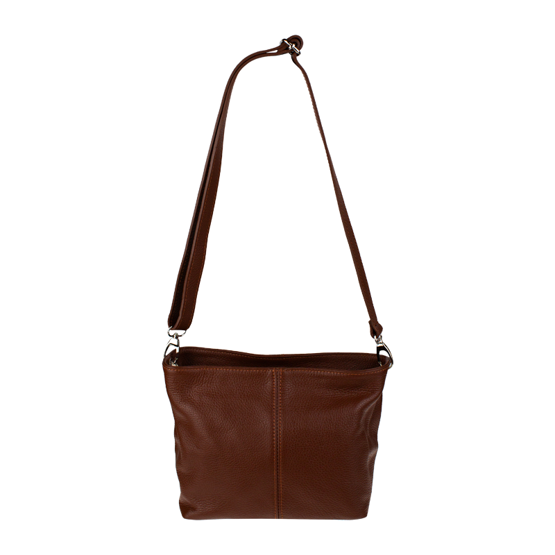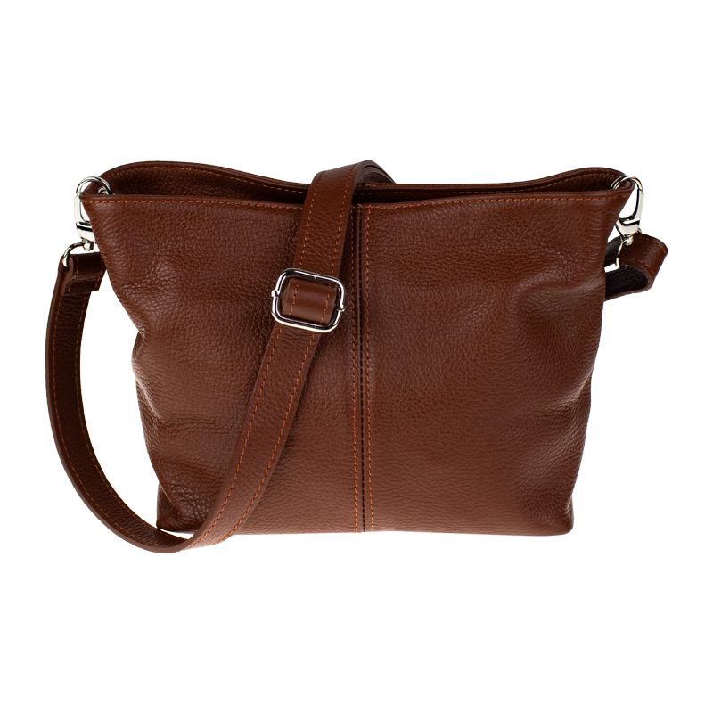 Kabelka nositelná přes rameno či cross-body (křížem) v moderní hnědé barvě. Tato kožená kabelka je uzavíratelná na zip. Uvnitř kabelky najdeme přepážku uprostřed, která zároveň slouží jako kapsa na zip, a na boční stěně pak kapsu na zip. Hloubka jejího dna je 13 cm. Kabelka má navíc nastavitelný popruh s maximální délkou cca 120 cm.