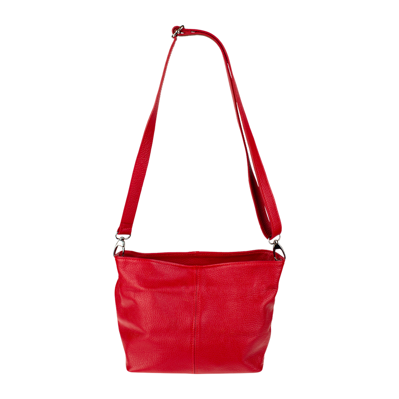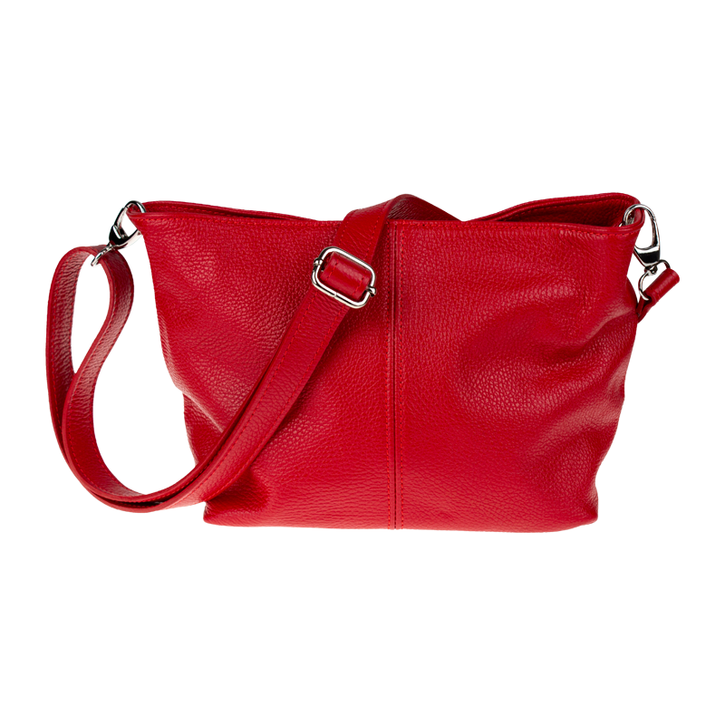 Červená kabelka nositelná přes rameno či cross-body (křížem). Tato kožená kabelka je uzavíratelná na zip. Uvnitř kabelky najdeme přepážku uprostřed, která zároveň slouží jako kapsa na zip, a na boční stěně pak kapsu na zip. Hloubka jejího dna je 13 cm. Kabelka má navíc nastavitelný popruh s maximální délkou cca 120 cm.