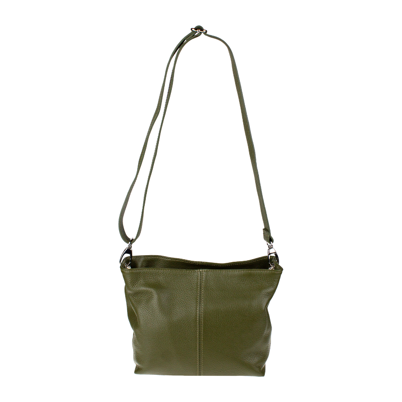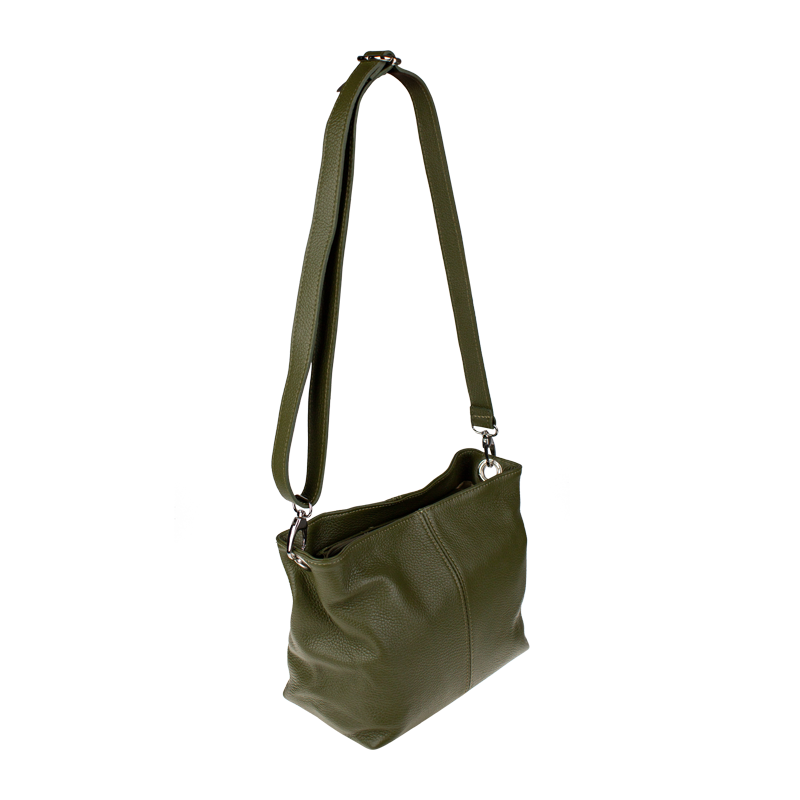Kabelka nositelná přes rameno či cross-body (křížem). Zelená kožená kabelka je uzavíratelná na zip. Uvnitř kabelky najdeme přepážku uprostřed, která zároveň slouží jako kapsa na zip, a na boční stěně pak kapsu na zip. Hloubka jejího dna je 13 cm. Kabelka má navíc nastavitelný popruh s maximální délkou cca 120 cm.