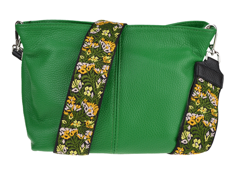Zelená kabelka nositelná přes rameno či cross-body (křížem). Tato kožená kabelka je uzavíratelná na zip. Uvnitř kabelky najdeme přepážku uprostřed, která zároveň slouží jako kapsa na zip, a na boční stěně pak kapsu na zip. Hloubka jejího dna je 13 cm. Kabelka má navíc nastavitelný popruh s maximální délkou cca 120 cm.