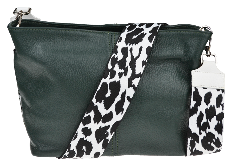 Kabelka nositelná přes rameno či cross-body (křížem). Zelená kožená kabelka je uzavíratelná na zip. Uvnitř kabelky najdeme přepážku uprostřed, která zároveň slouží jako kapsa na zip, a na boční stěně pak kapsu na zip. Hloubka jejího dna je 13 cm.