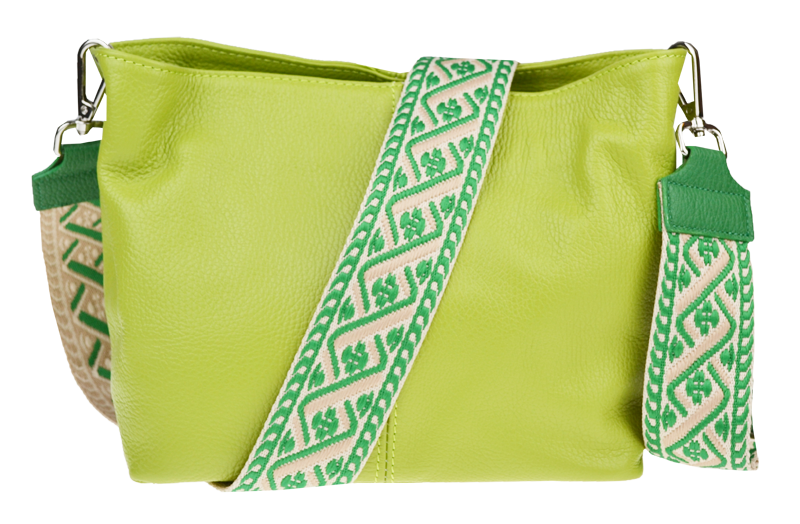 Kabelka nositelná přes rameno či cross-body (křížem). Zelená kožená kabelka je uzavíratelná na zip. Uvnitř kabelky najdeme přepážku uprostřed, která zároveň slouží jako kapsa na zip, a na boční stěně pak kapsu na zip. Hloubka jejího dna je 13 cm.