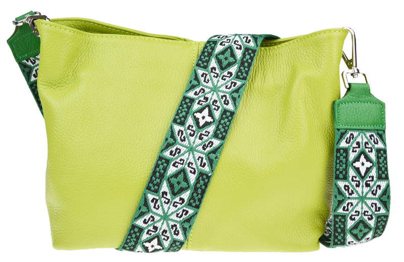 Kabelka nositelná přes rameno či cross-body (křížem). Zelená kožená kabelka je uzavíratelná na zip. Uvnitř kabelky najdeme přepážku uprostřed, která zároveň slouží jako kapsa na zip, a na boční stěně pak kapsu na zip. Hloubka jejího dna je 13 cm.
