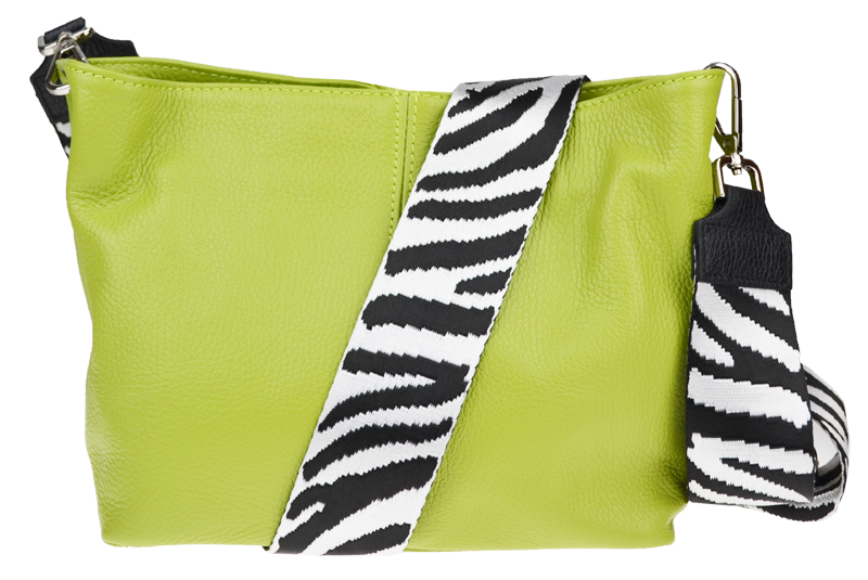 Kabelka nositelná přes rameno či cross-body (křížem). Zelená kožená kabelka je uzavíratelná na zip. Uvnitř kabelky najdeme přepážku uprostřed, která zároveň slouží jako kapsa na zip, a na boční stěně pak kapsu na zip. Hloubka jejího dna je 13 cm.