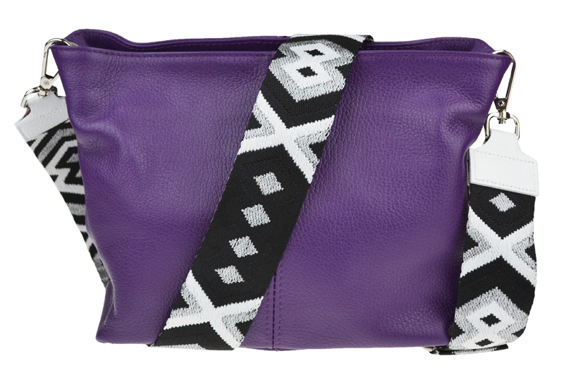 Fialová kabelka nositelná přes rameno či cross-body (křížem). Tato kožená kabelka je uzavíratelná na zip. Uvnitř kabelky najdeme přepážku uprostřed, která zároveň slouží jako kapsa na zip, a na boční stěně pak kapsu na zip. Hloubka jejího dna je 13 cm.