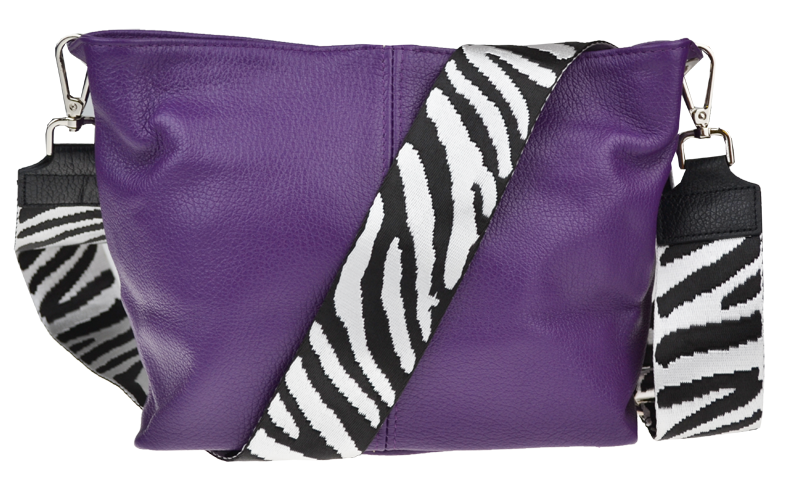 Fialová kabelka nositelná přes rameno či cross-body (křížem). Tato kožená kabelka je uzavíratelná na zip. Uvnitř kabelky najdeme přepážku uprostřed, která zároveň slouží jako kapsa na zip, a na boční stěně pak kapsu na zip. Hloubka jejího dna je 13 cm.