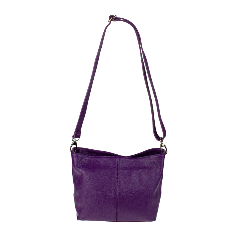 fialová kabelka nositelná přes rameno či cross-body (křížem). Tato kožená kabelka je uzavíratelná na zip. Uvnitř kabelky najdeme přepážku uprostřed, která zároveň slouží jako kapsa na zip, a na boční stěně pak kapsu na zip. Hloubka jejího dna je 13 cm. Kabelka má navíc nastavitelný popruh s maximální délkou cca 120 cm.