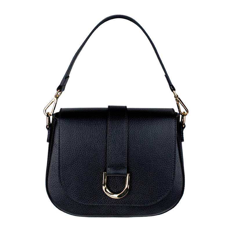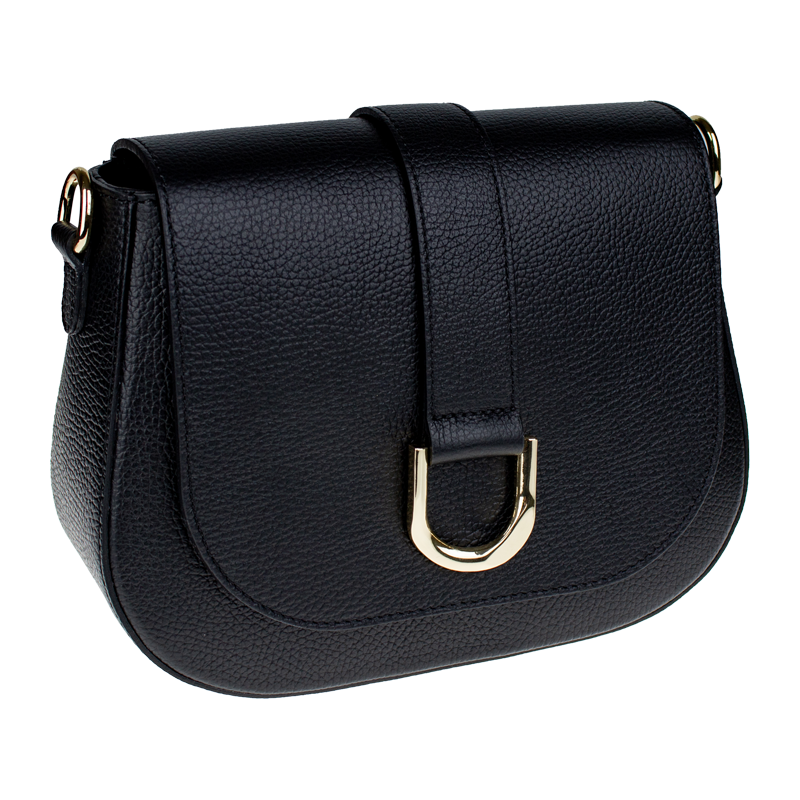 Černá kabelka nositelná přes rameno či cross-body (křížem). Tato kožená kabelka je uzavíratelná na patentku a uvnitř nalezneme přihrádku na zip. Kabelka má  nastavitelný popruh s maximální délkou cca 118 cm.