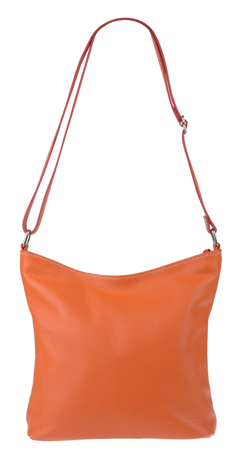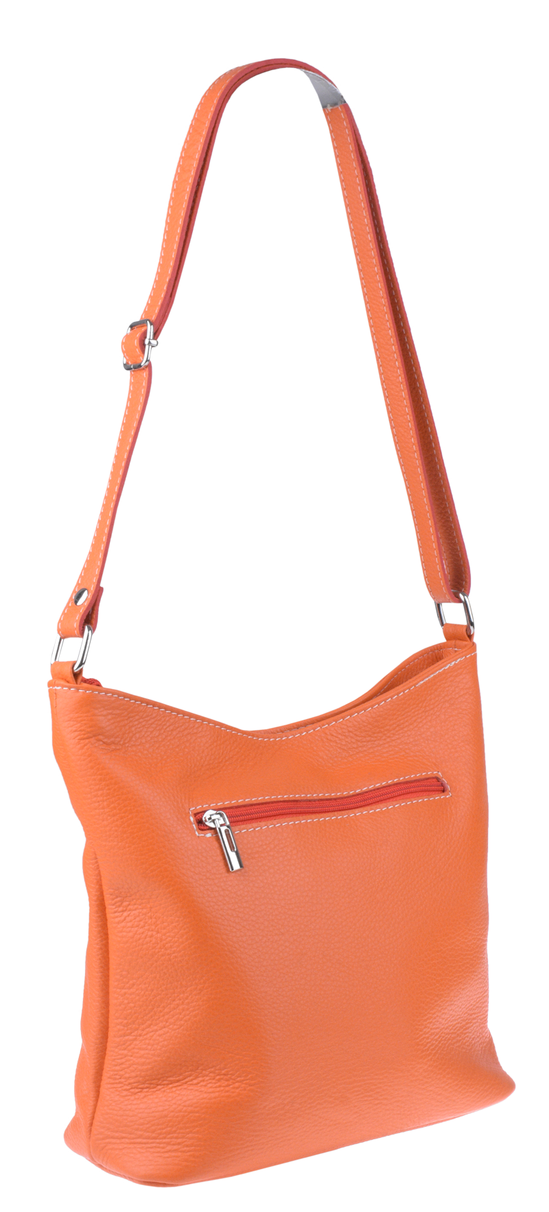 Klasická praktická kabelka s jednoduchým designem v oranžové barvě. Nositelná přes rameno nebo crossbody. Kabelka je uzavíratelná na zip a je vyrobena z pravé poctivé kůže. Uvnitř kabelky najdeme přepážku uprostřed, která zároveň slouží jako kapsa na zip, a na bočních stěnách pak kapsu na zip a na druhé straně další malou kapsu. Délka popruhu je 120 cm.
