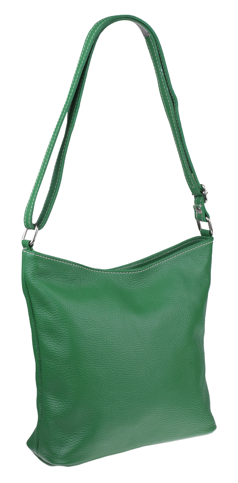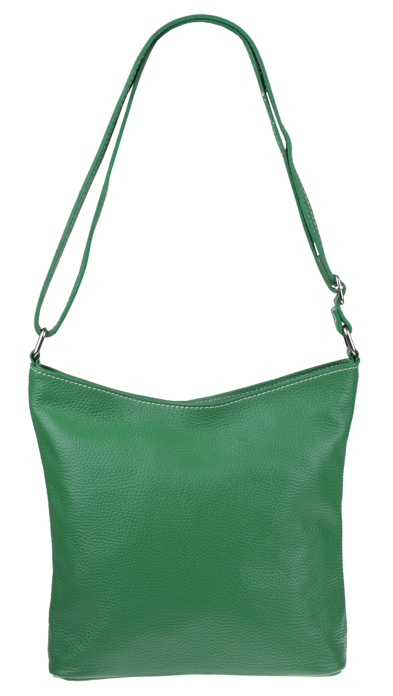 Klasická praktická kabelka s jednoduchým designem v zelené barvě. Nositelná přes rameno nebo crossbody. Kabelka je uzavíratelná na zip a je vyrobena z pravé poctivé kůže. Uvnitř kabelky najdeme přepážku uprostřed, která zároveň slouží jako kapsa na zip, a na bočních stěnách pak kapsu na zip a na druhé straně další malou kapsu. Délka popruhu je 120 cm.