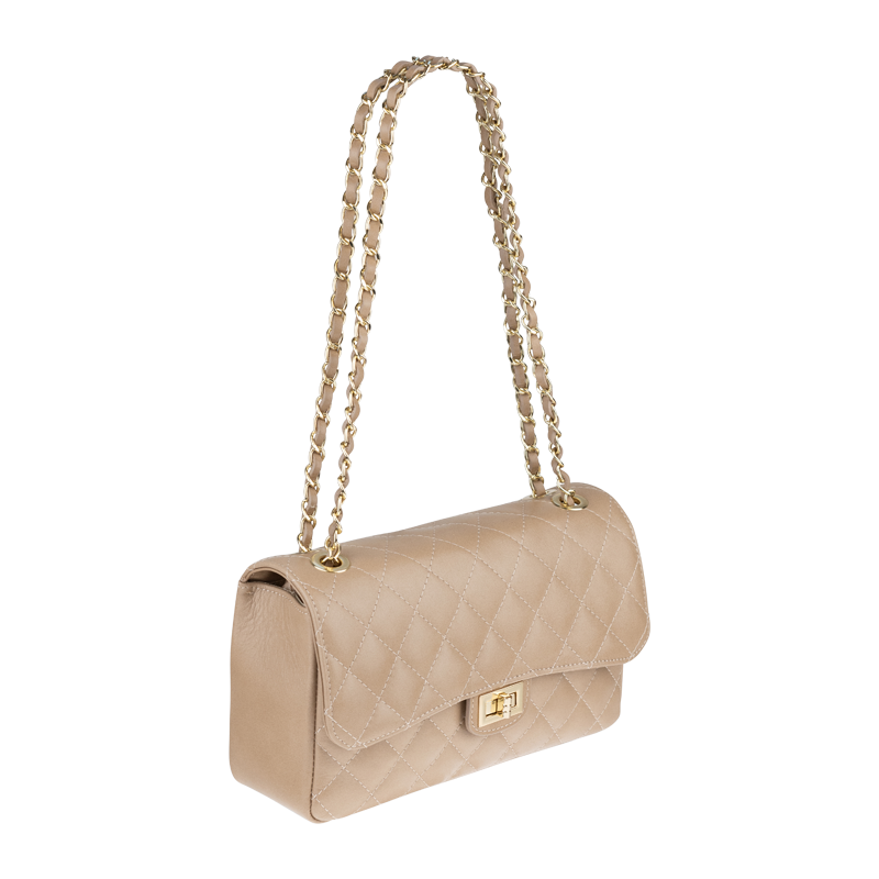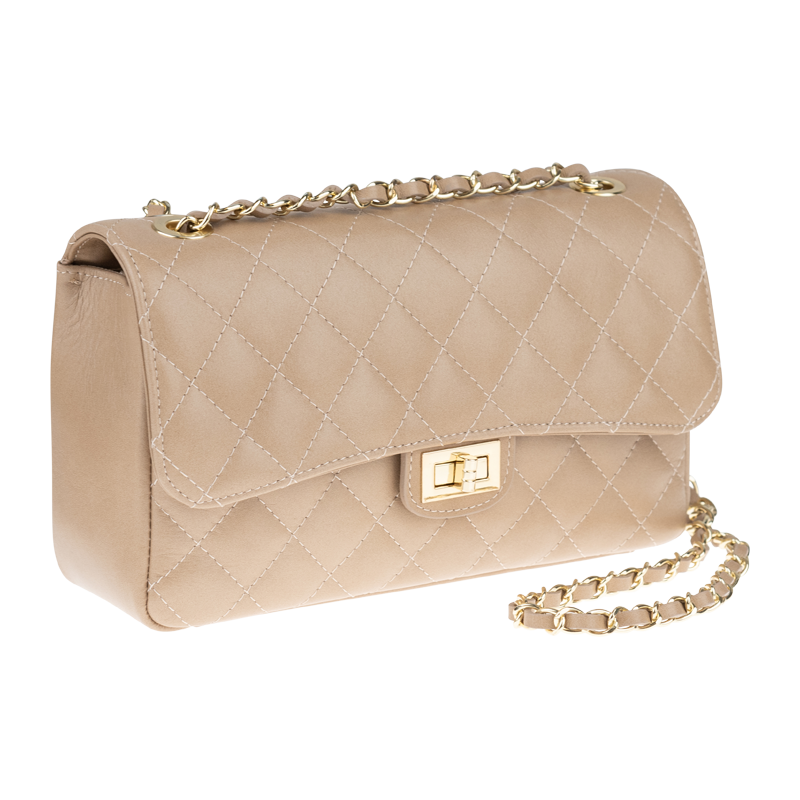 Krásná béžová kabelka z měkké kůže. Tato originální kabelka určená k nošení přes rameno je vhodným doplňkem pro pravidelné nošení. Kabelka je uzavíratelná důmyslnou patentkou, která zároveň slouží jako ozdobný prvek. Uvnitř kabelky nalezneme kapsu na zip. Délka řetízku přes rameno je 120 cm.