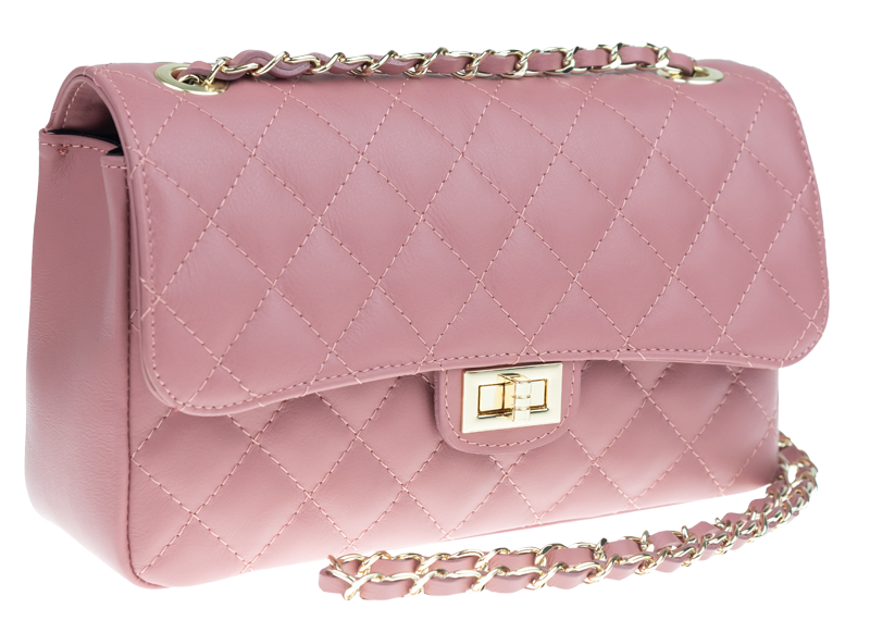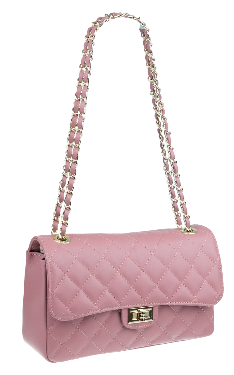 Krásná růžová kabelka z měkké kůže. Tato originální kabelka určená k nošení přes rameno je vhodným doplňkem pro pravidelné nošení. Kabelka je uzavíratelná důmyslnou patentkou, která zároveň slouží jako ozdobný prvek. Uvnitř kabelky nalezneme kapsu na zip. Délka řetízku (zlaté barvy) je přes rameno je 120 cm.