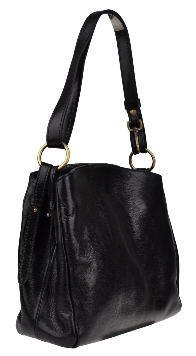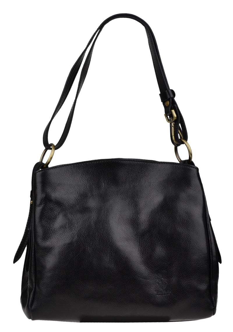Praktická, ale zároveň elegantní kabelka s jednoduchým designem černé barvě. Nositelná přes rameno. Je vyrobena z leštěné hladké kůže. Popruh na rameno je nastavitelný na dvě délky.