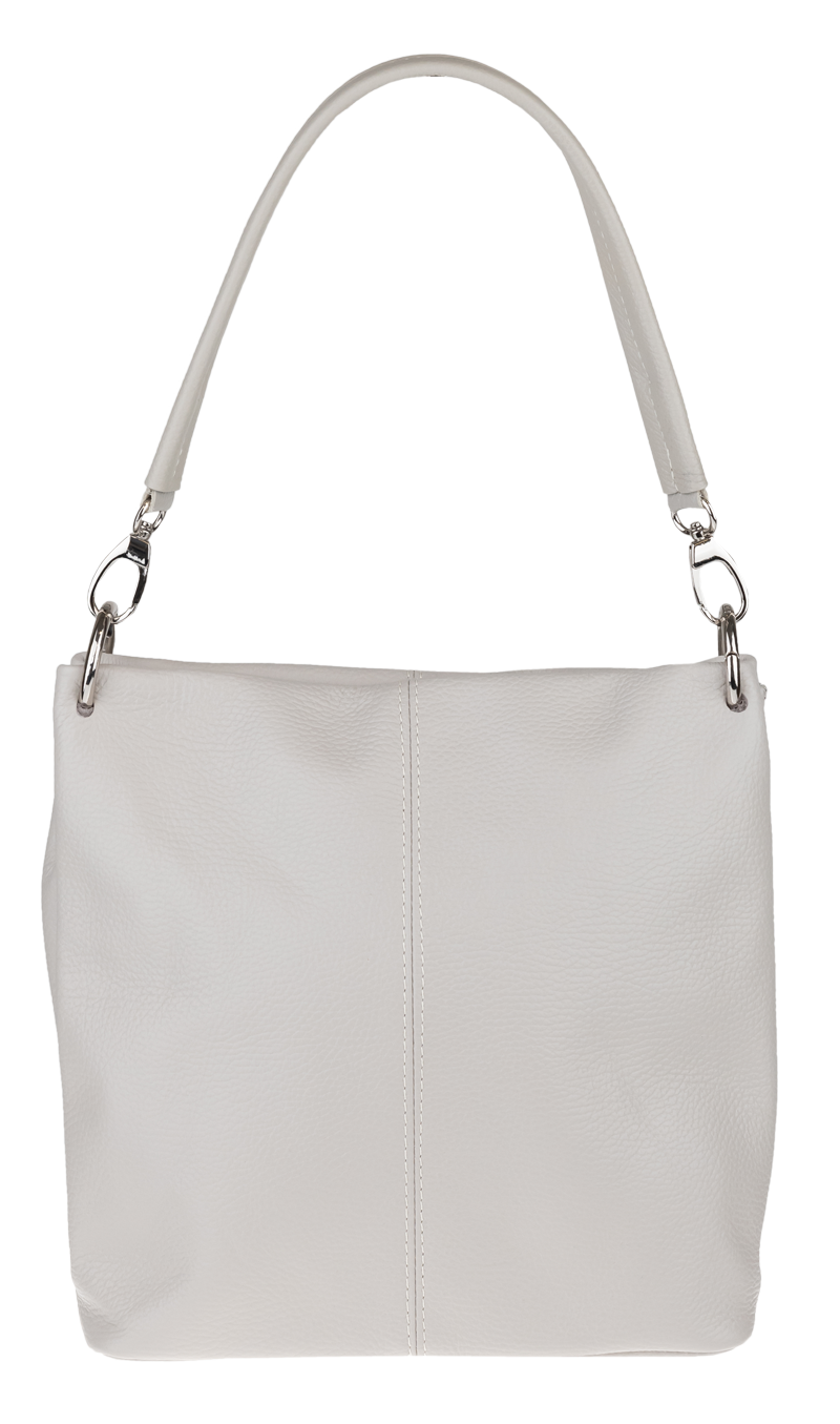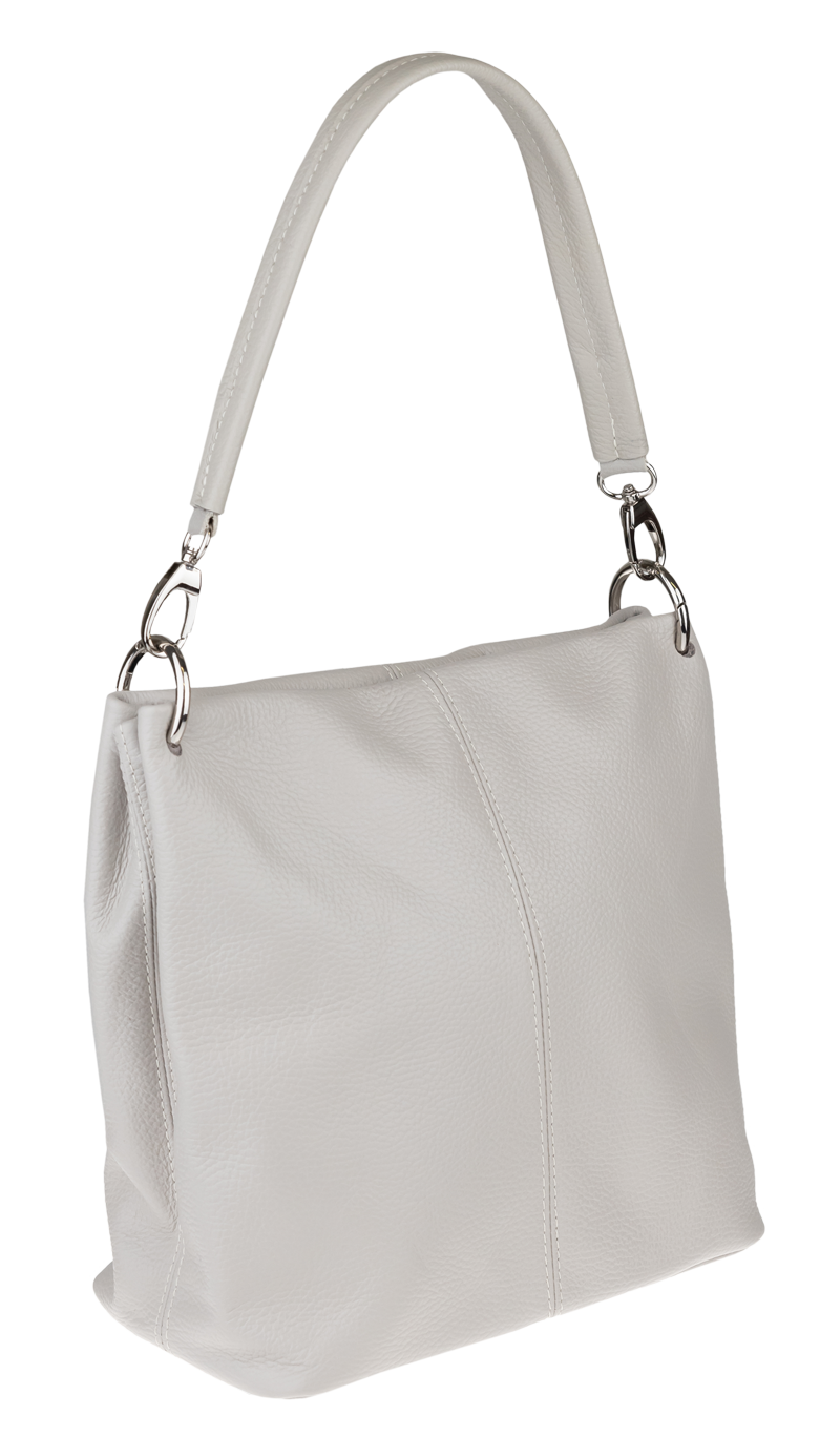 Klasická praktická kabelka s jednoduchým designem v šedivé barvě. Nositelná přes rameno. Kabelka je uzavíratelná na zip a je vyrobena z pravé poctové kůže. Uvnitř kabelky najdeme přepážku uprostřed, která zároveň slouží jako kapsa na zip, a na bočních stěnách pak kapsu na zip a na druhé straně další malou kapsu. Hloubka její dna činí 14,5 cm.
