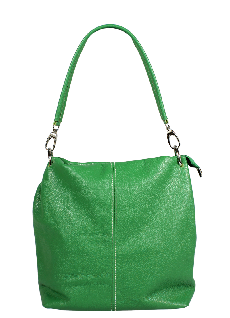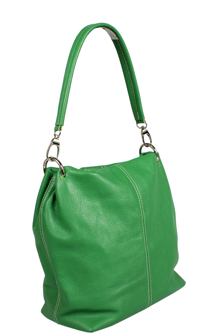 Klasická praktická kabelka s jednoduchým designem v zelené barvě. Nositelná přes rameno. Kabelka je uzavíratelná na zip a je vyrobena z pravé poctové kůže. Uvnitř kabelky najdeme přepážku uprostřed, která zároveň slouží jako kapsa na zip, a na bočních stěnách pak kapsu na zip a na druhé straně další malou kapsu.Hloubka její dna činí 14,5 cm.