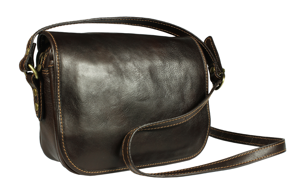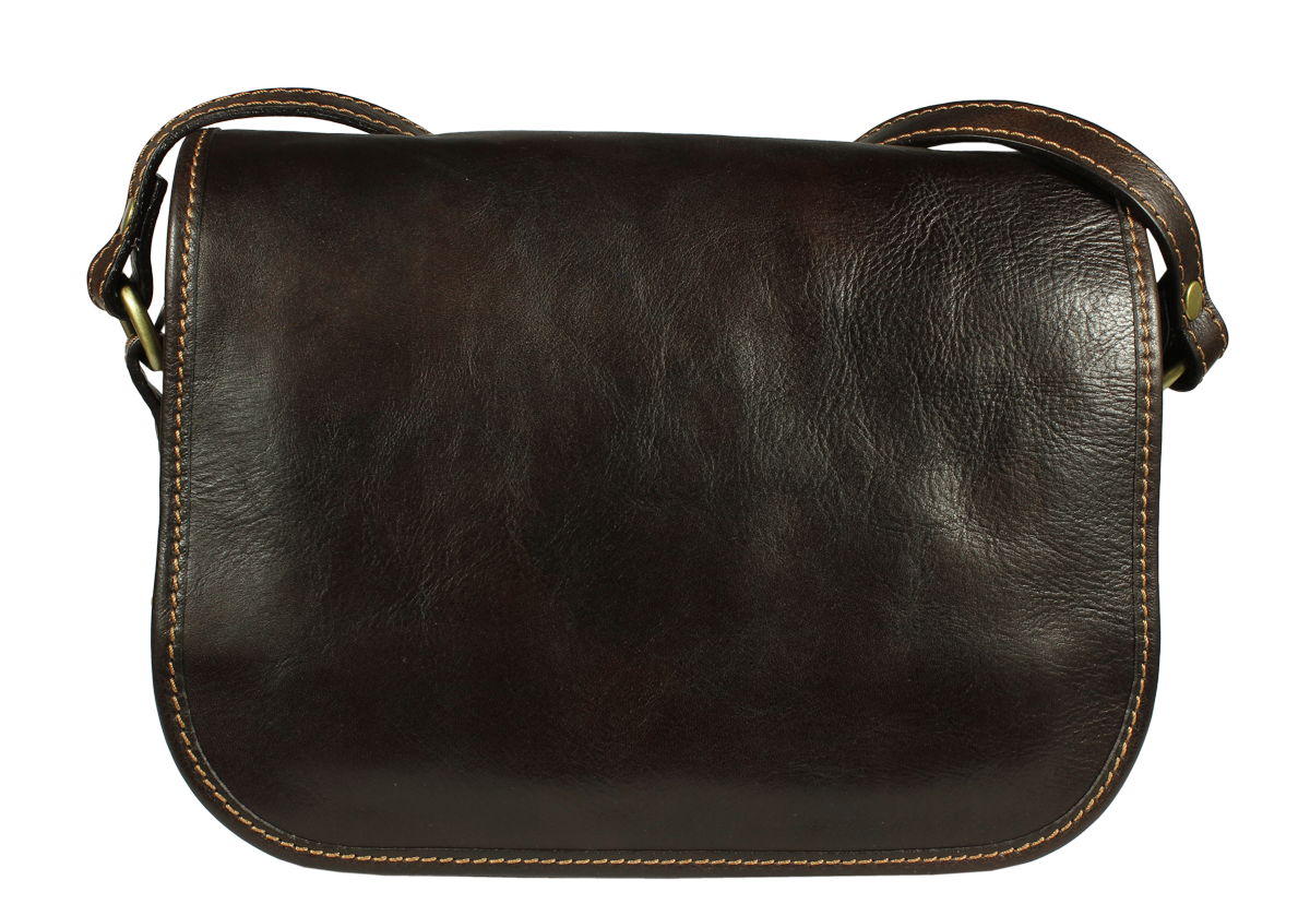 Kožená kabelka v tmavě hnědé barvě. Kabelka se uzavírá pomocí poklopu na patentky. Uvnitř kabelky jsou dvě přihrádky a zavírací kapsa na zip.