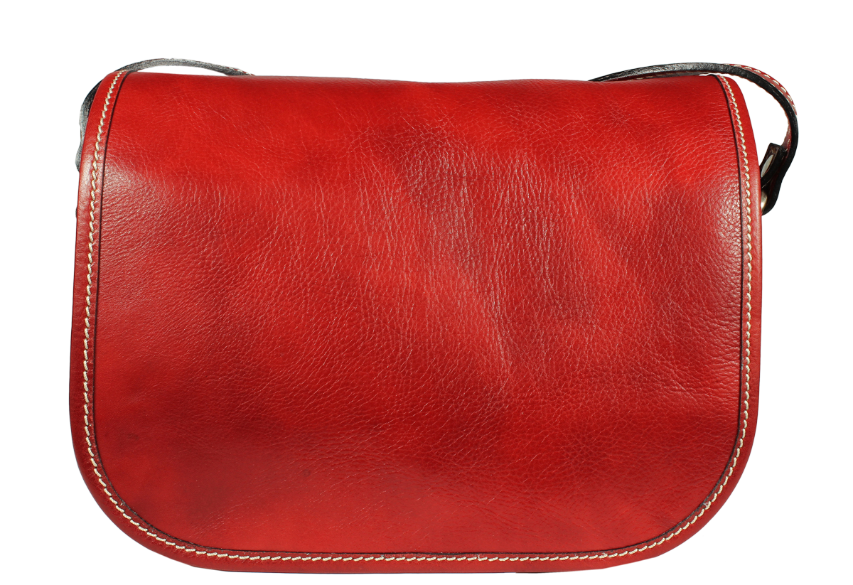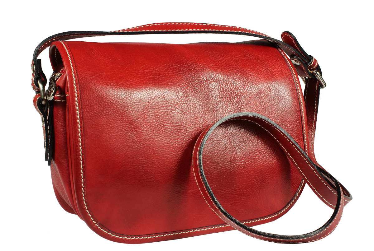 Kožená kabelka v červené barvě. Kabelka se uzavírá pomocí poklopu na patentky. Uvnitř kabelky jsou dvě přihrádky a zavírací kapsa na zip.
