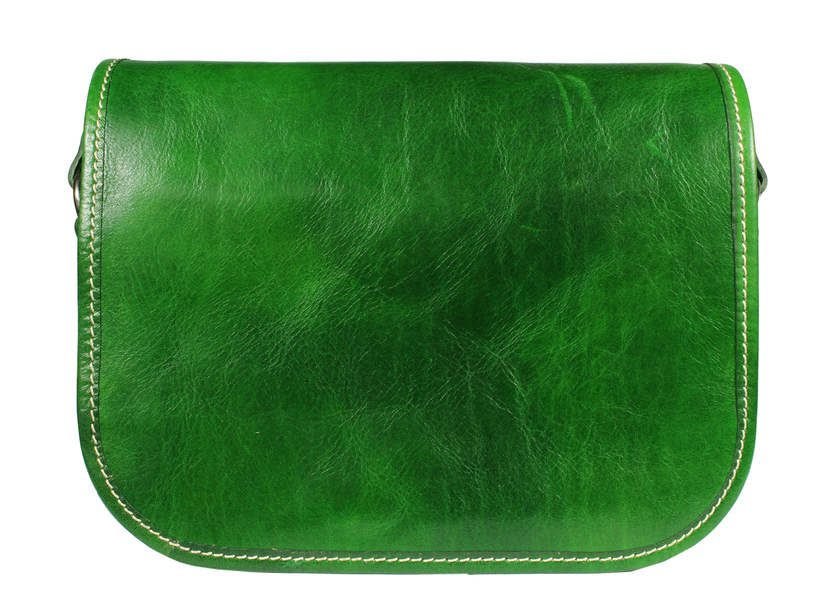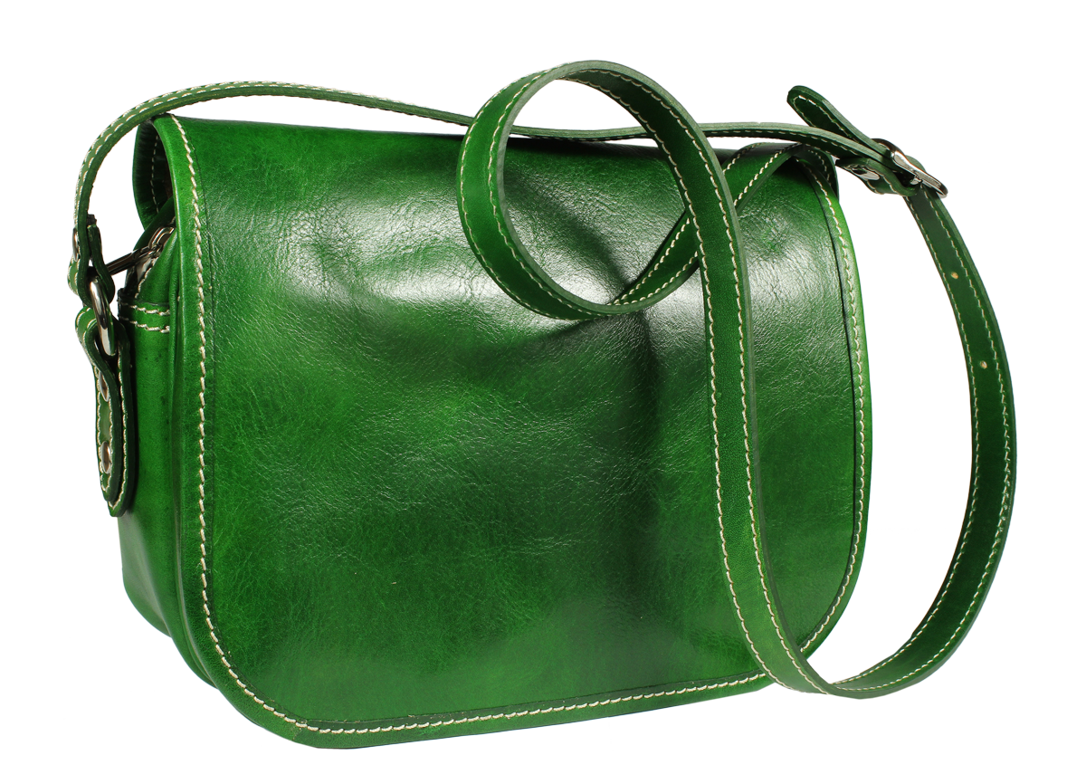 Kožená kabelka v zelené barvě. Kabelka se uzavírá pomocí poklopu na patentky. Uvnitř kabelky jsou dvě přihrádky a zavírací kapsa na zip.