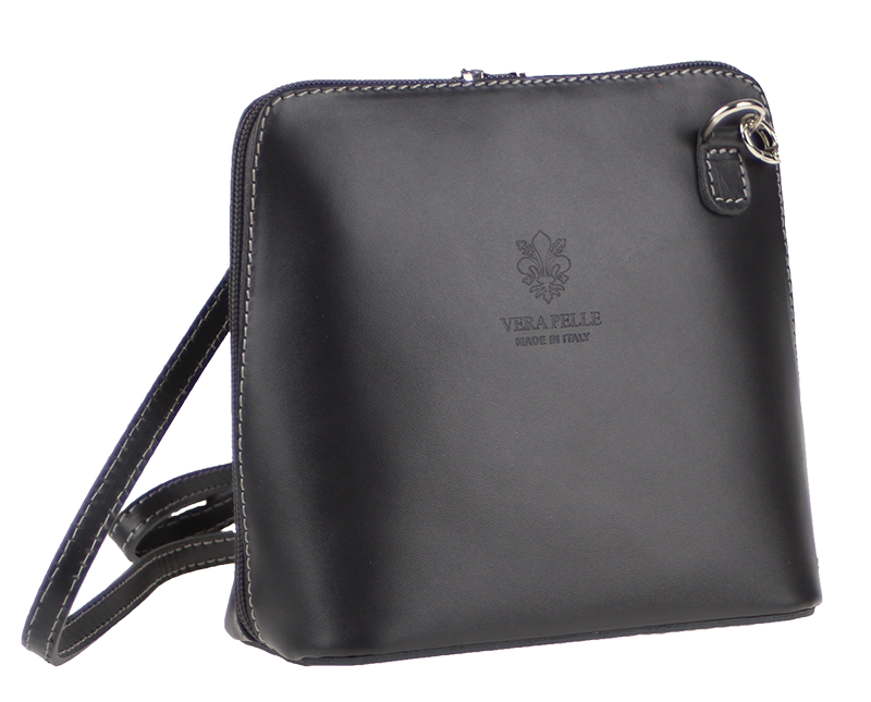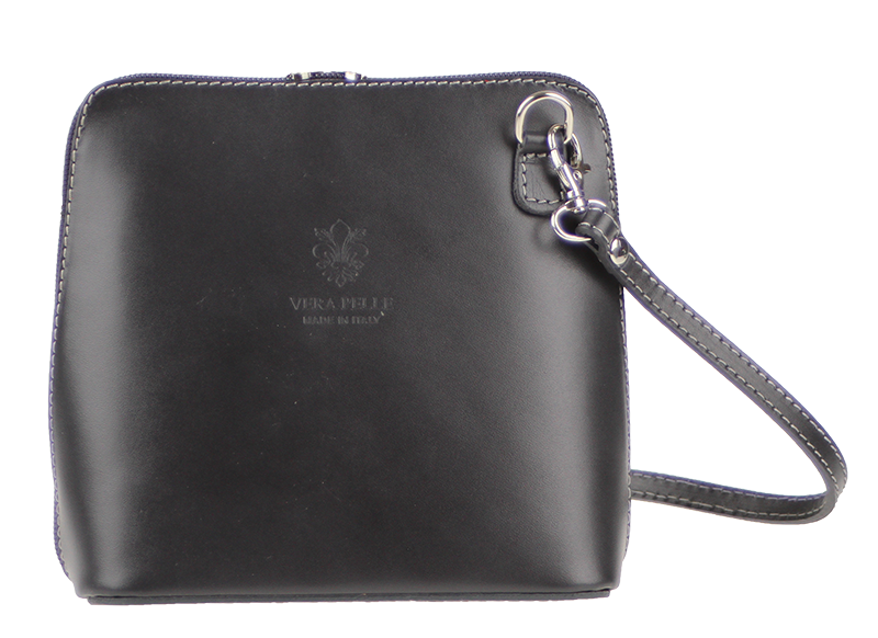 Elegantní, ale zároveň praktická, velmi tmavě- šedá ( až s nádechem černé), kabelka malých rozměrů vyrobena z pravé kůže. Díky tenkému pásku je nositelná přes rameno. Zip, kterým se uzavírá, vede po hraně kabelky až po spodní okraj na obou stranách, a proto je její vnitřek dobře dostupný. Na vnější zadní straně najdete na kabelce malou kapsu na zip a uvnitř dělí celý prostor na dvě části příčka, která současně slouží jako kapsa na zip. Hloubka jejího dna je 8 cm. Délka přídavného popruhu je cca 120 cm.