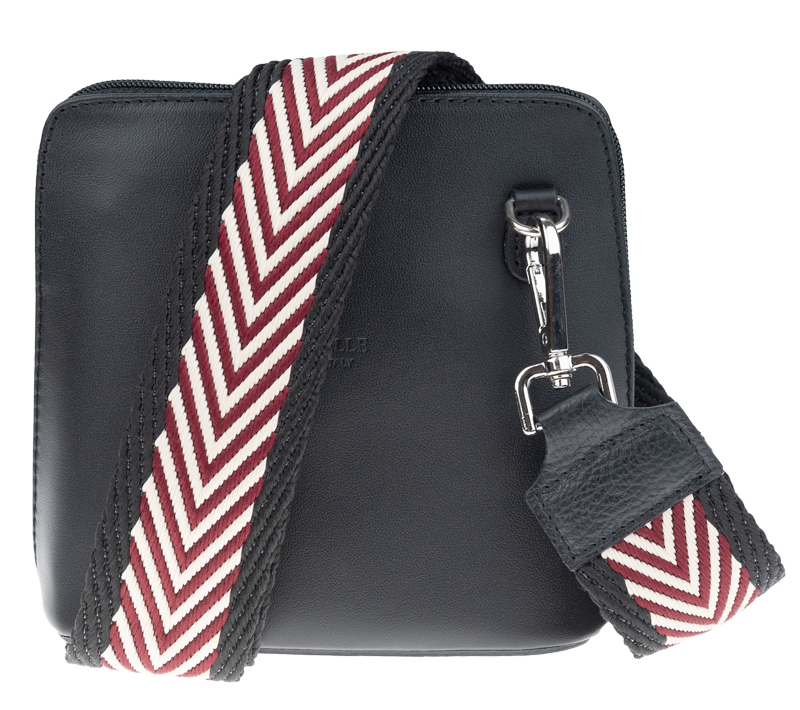 Elegantní, ale zároveň velmi praktická kabelka malých rozměrů vyrobena z pravé černé  kůže. Díky tenkému pásku je nositelná přes rameno. Zip, kterým se uzavírá, vede po hraně kabelky až po spodní okraj na obou stranách, a proto je její vnitřek dobře dostupný. Na vnější zadní straně najdete na kabelce malou kapsu na zip a uvnitř dělí celý prostor na dvě části příčka, která současně slouží jako kapsa na zip. Hloubka jejího dna je 8 cm. Délka přídavného popruhu je cca 120 cm.