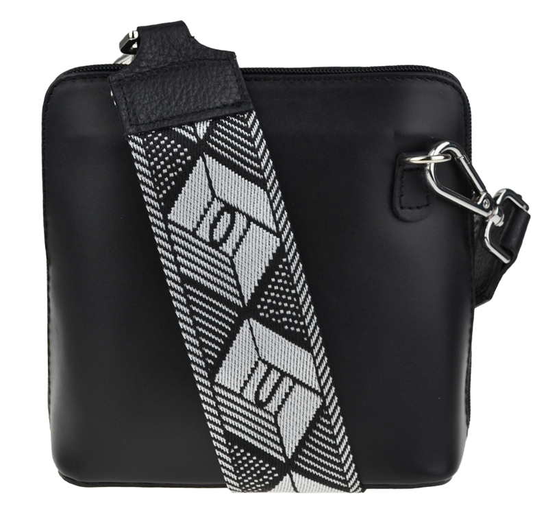 Elegantní, ale zároveň velmi praktická kabelka malých rozměrů vyrobena z pravé černé  kůže. Díky tenkému pásku je nositelná přes rameno. Zip, kterým se uzavírá, vede po hraně kabelky až po spodní okraj na obou stranách, a proto je její vnitřek dobře dostupný. Na vnější zadní straně najdete na kabelce malou kapsu na zip a uvnitř dělí celý prostor na dvě části příčka, která současně slouží jako kapsa na zip. Hloubka jejího dna je 8 cm. Délka přídavného popruhu je cca 120 cm.