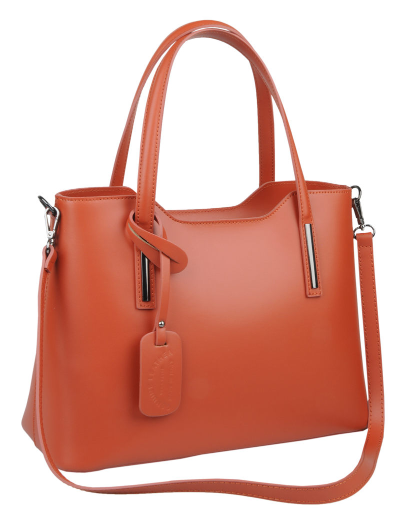 Praktická kabelka v oranžovém provedení pro každodenní nošení vyrobená z pevné pravé kůže. Nosí se v ruce nebo na rameni. Kabelka je uzavíratelná na zip. Součástí balení je přídavný  popruh – cca 107 cm v plné délce. Uvnitř kabelky najdeme přepážku uprostřed, která zároveň slouží jako kapsa na zip, a na bočních stěnách pak kapsu na zip a 2 malé kapsy vhodné např. pro mobil a peněženku.