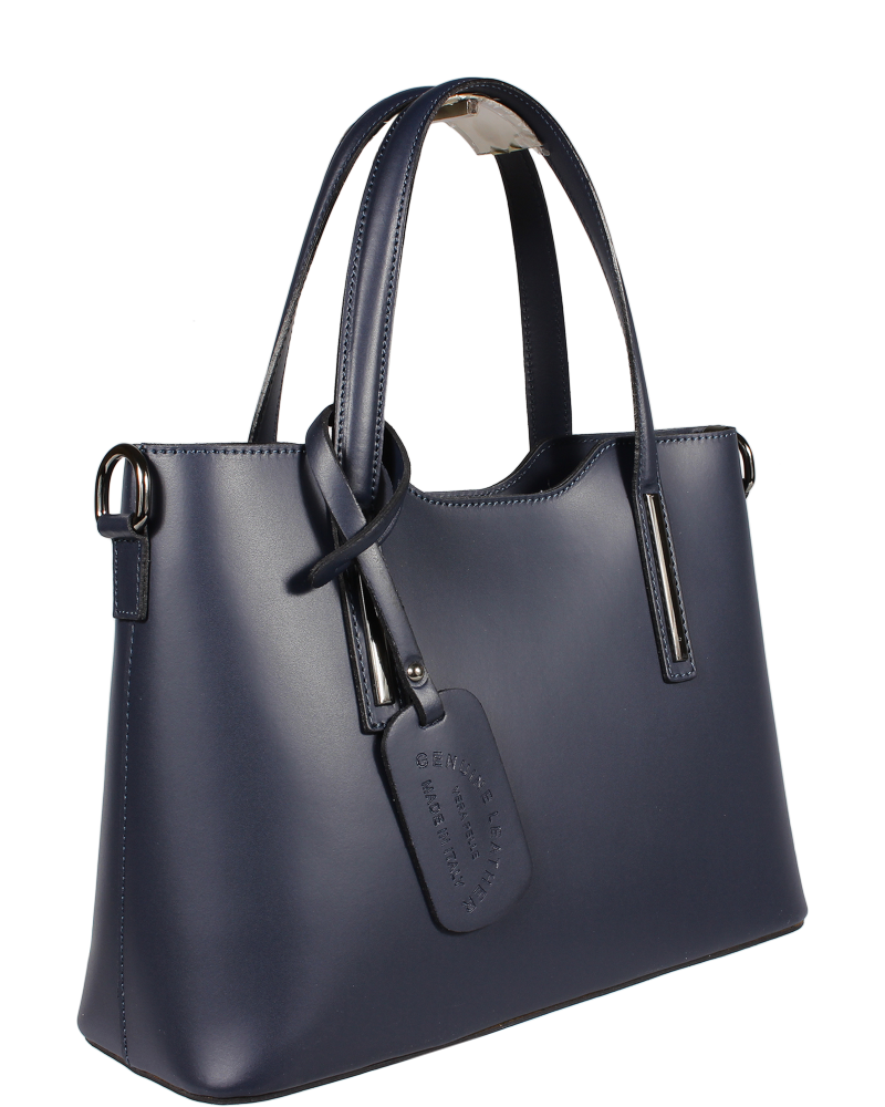 Praktická kabelka v modrém provedení pro každodenní nošení vyrobená z pevné pravé kůže. Nosí se v ruce nebo na rameni. Kabelka je uzavíratelná na zip. Součástí balení je přídavný nastavitelný popruh – cca 107 cm v plné délce. Uvnitř kabelky najdeme přepážku uprostřed, která zároveň slouží jako kapsa na zip, a na bočních stěnách pak kapsu na zip a 2 malé kapsy vhodné např. pro mobil a peněženku.