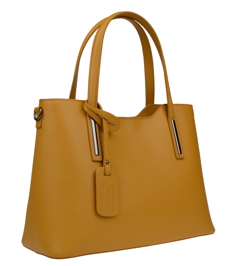Praktická kabelka ve žlutém provedení pro každodenní nošení vyrobená z pevné pravé kůže. Nosí se v ruce nebo na rameni. Kabelka je uzavíratelná na zip. Součástí balení je přídavný popruh – cca 107 cm v plné délce. Uvnitř kabelky najdeme přepážku uprostřed, která zároveň slouží jako kapsa na zip, a na bočních stěnách pak kapsu na zip a 2 malé kapsy vhodné např. pro mobil a peněženku.