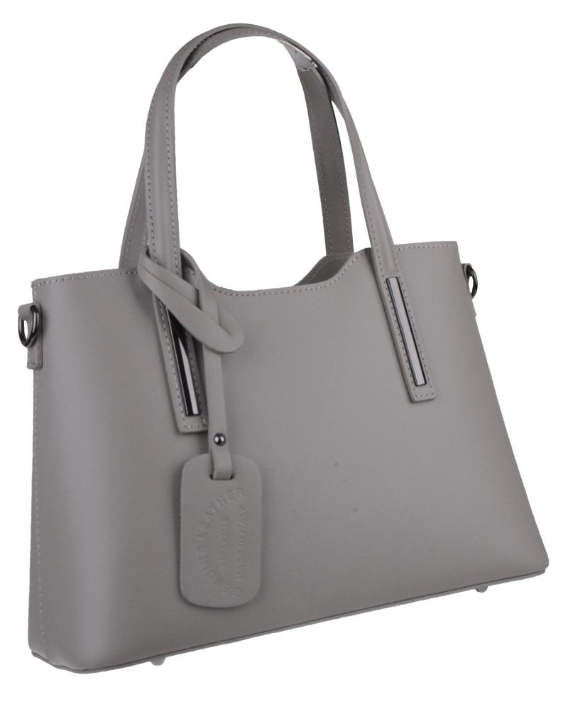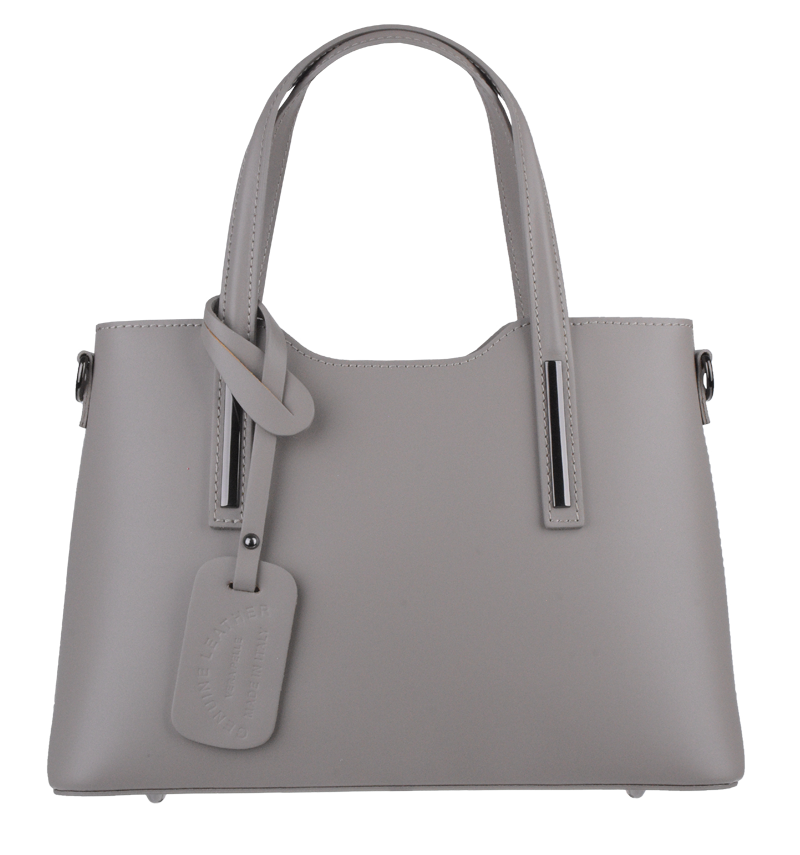 Praktická kabelka v šedém provedení pro každodenní nošení vyrobená z pevné pravé kůže. Nosí se v ruce nebo na rameni. Kabelka je uzavíratelná na zip. Součástí balení je přídavný popruh – cca 107 cm v plné délce. Uvnitř kabelky najdeme přepážku uprostřed, která zároveň slouží jako kapsa na zip, a na bočních stěnách pak kapsu na zip a 2 malé kapsy vhodné např. pro mobil a peněženku.