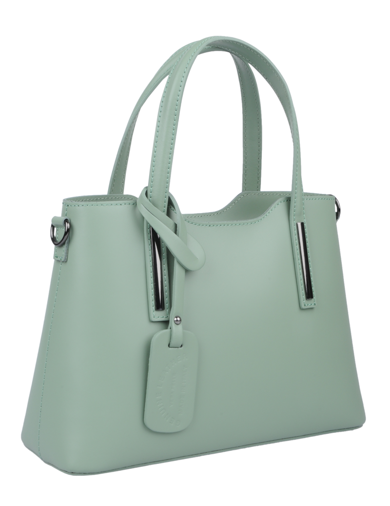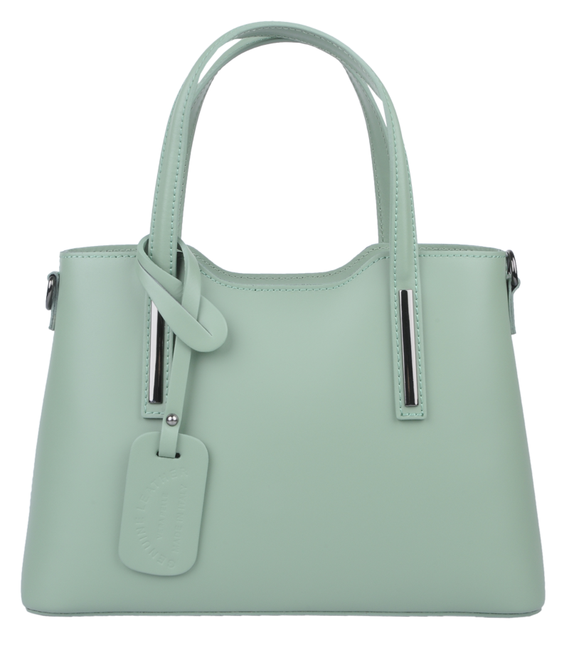 Praktická kabelka v mentolové provedení pro každodenní nošení vyrobená z pevné pravé kůže. Nosí se v ruce nebo na rameni. Kabelka je uzavíratelná na zip. Součástí balení je přídavný popruh – cca 107 cm v plné délce. Uvnitř kabelky najdeme přepážku uprostřed, která zároveň slouží jako kapsa na zip, a na bočních stěnách pak kapsu na zip a 2 malé kapsy vhodné např. pro mobil a peněženku.
