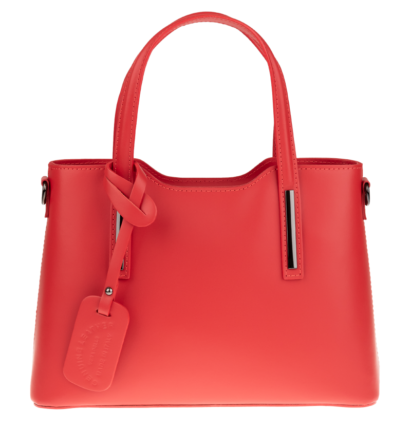 Praktická kabelka v červeném provedení pro každodenní nošení vyrobená z pevné pravé kůže. Nosí se v ruce nebo na rameni. Kabelka je uzavíratelná na zip. Součástí balení je přídavný popruh – cca 107 cm v plné délce. Uvnitř kabelky najdeme přepážku uprostřed, která zároveň slouží jako kapsa na zip, a na bočních stěnách pak kapsu na zip a 2 malé kapsy vhodné např. pro mobil a peněženku.