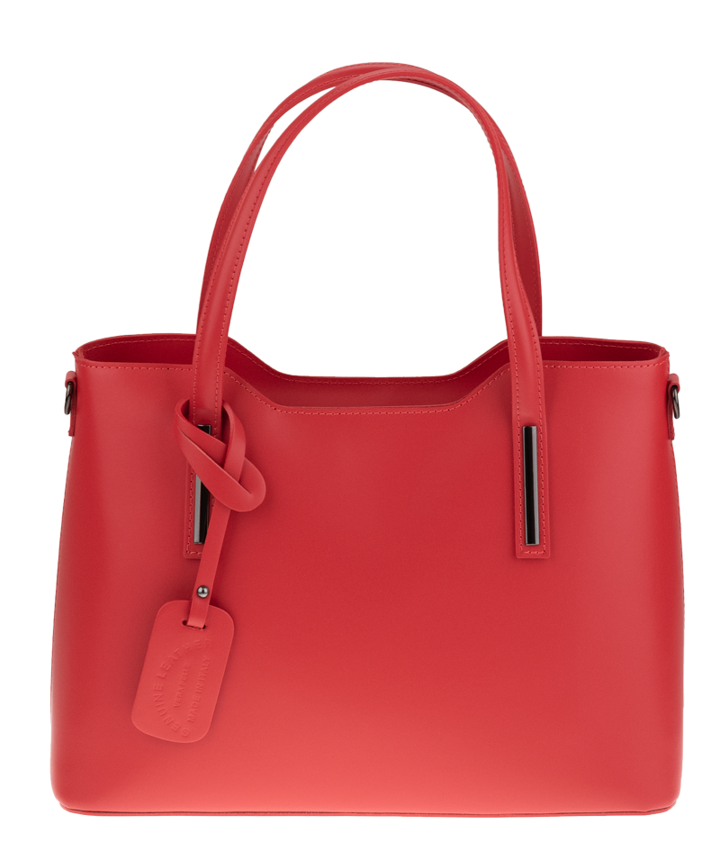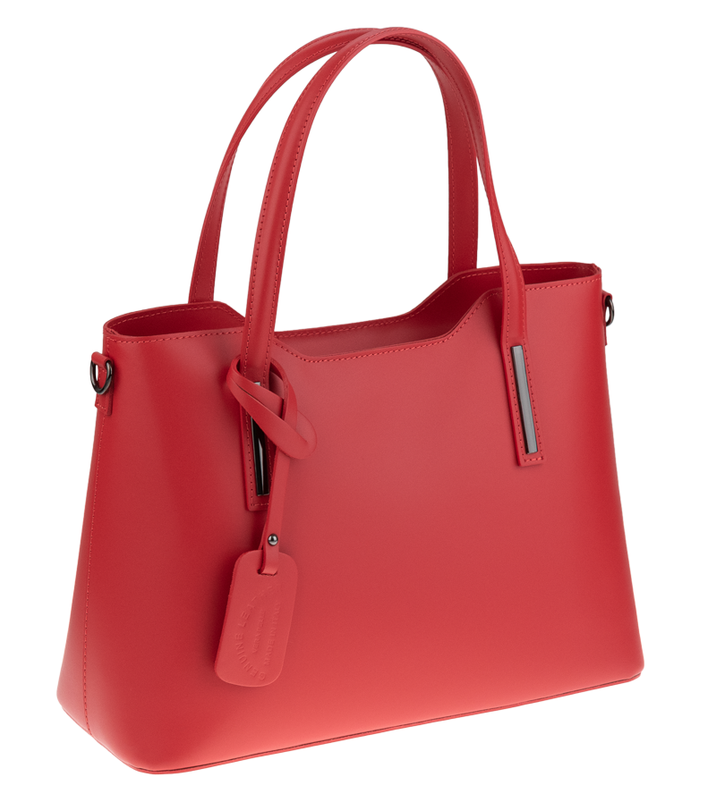 Praktická kabelka v červeném provedení pro každodenní nošení vyrobená z pevné pravé kůže. Nosí se v ruce nebo na rameni. Kabelka je uzavíratelná na zip. Součástí balení je přídavný popruh – cca 107 cm v plné délce. Uvnitř kabelky najdeme přepážku uprostřed, která zároveň slouží jako kapsa na zip, a na bočních stěnách pak kapsu na zip a 2 malé kapsy vhodné např. pro mobil a peněženku.