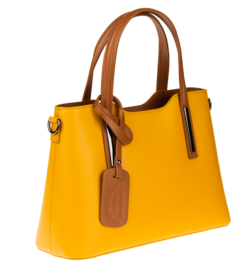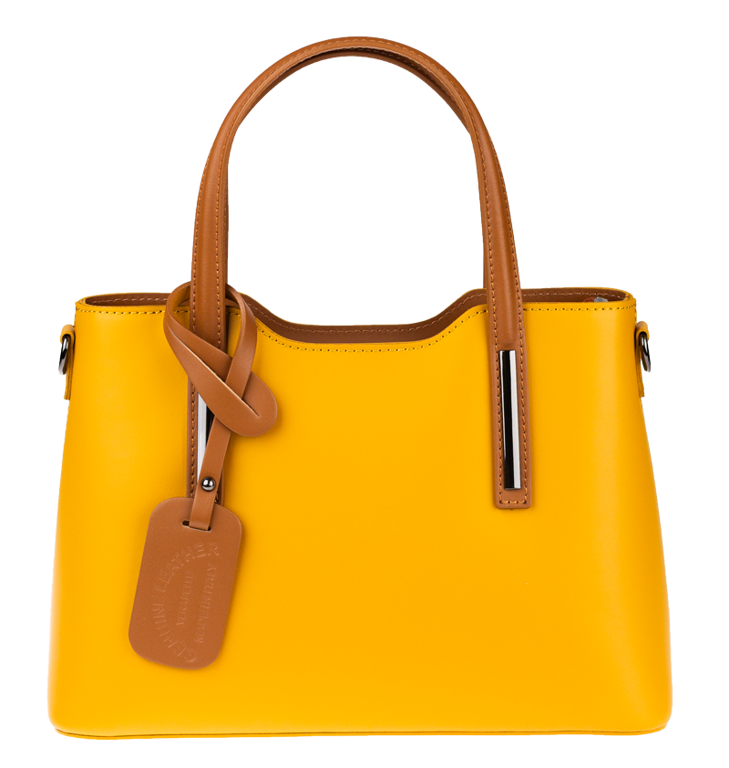 Praktická kabelka ve žlutém provedení pro každodenní nošení vyrobená z pevné pravé kůže. Nosí se v ruce nebo na rameni. Kabelka je uzavíratelná na zip. Součástí balení je přídavný nastavitelný popruh – cca 107 cm v plné délce. Uvnitř kabelky najdeme přepážku uprostřed, která zároveň slouží jako kapsa na zip, a na bočních stěnách pak kapsu na zip a 2 malé kapsy vhodné např. pro mobil a peněženku.