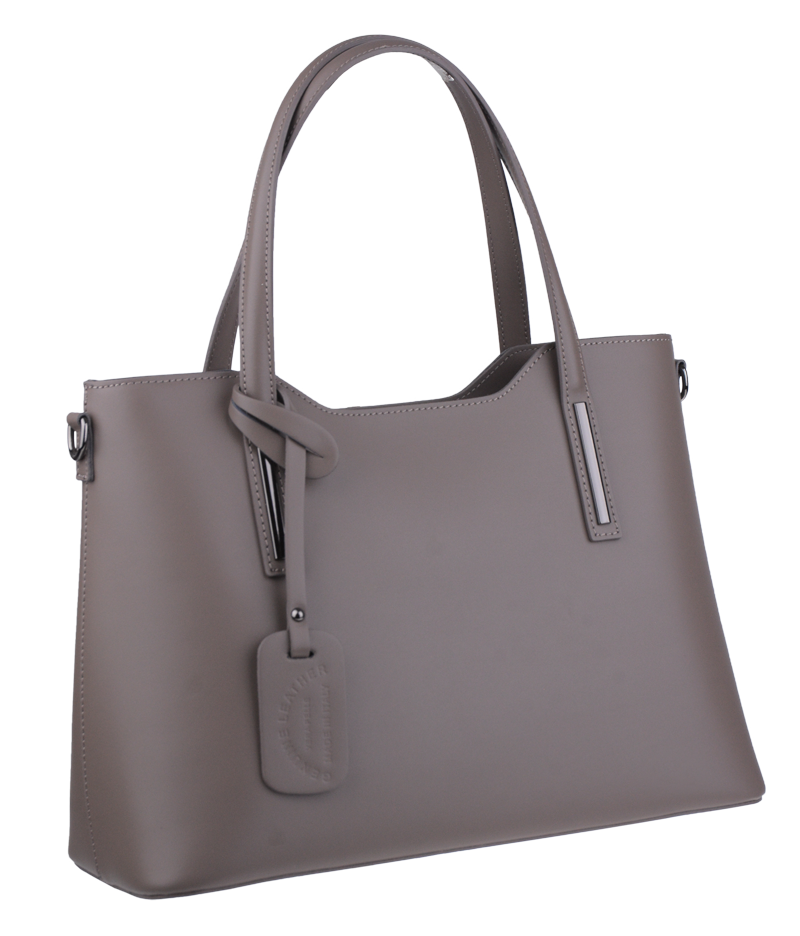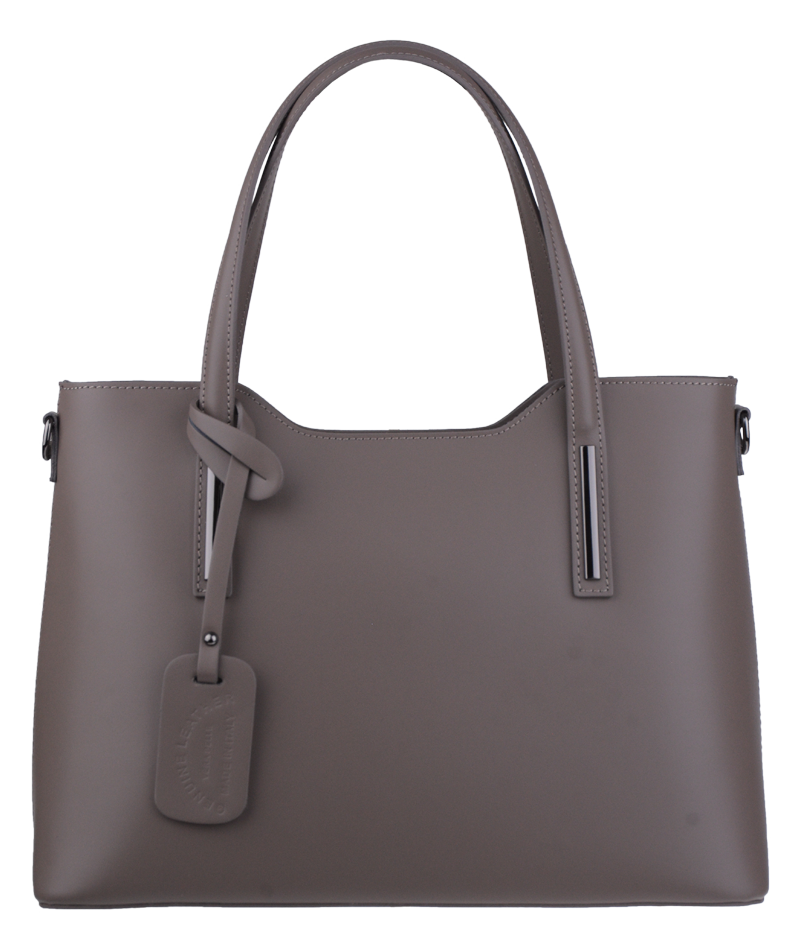 Praktická kabelka v šedo-hnědém provedení pro každodenní nošení vyrobená z pevné pravé kůže. Nosí se v ruce nebo na rameni. Kabelka je uzavíratelná na zip. Součástí balení je přídavný popruh – cca 107 cm v plné délce. Uvnitř kabelky najdeme přepážku uprostřed, která zároveň slouží jako kapsa na zip, a na bočních stěnách pak kapsu na zip a 2 malé kapsy vhodné např. pro mobil a peněženku.